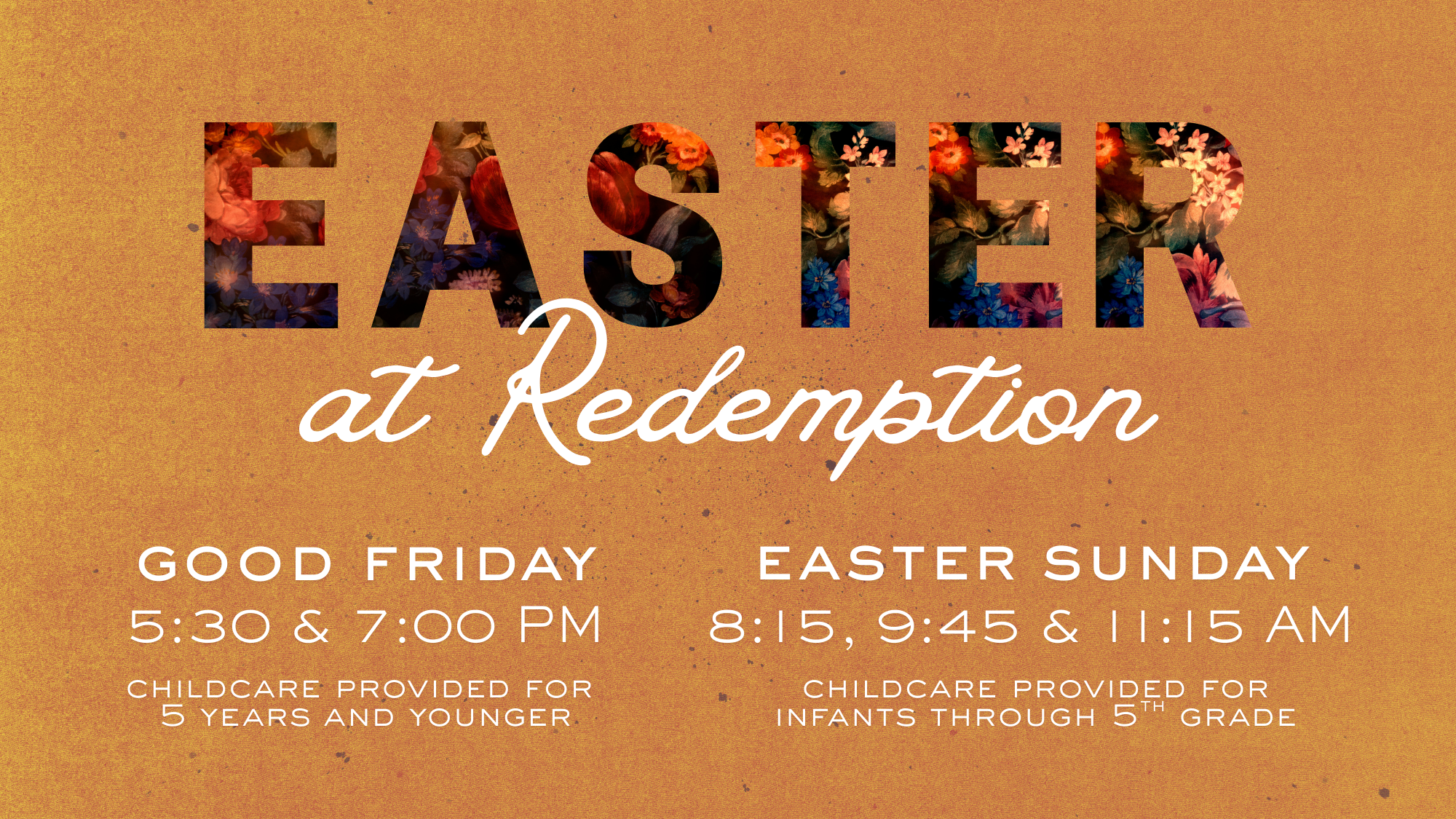 Join us this Easter as we celebrate the death and resurrection of our savior Jesus! We will be having a special Good Friday service on April 3rd at 5:30 and 7 PM. On Easter Sunday, April 5th, we will have all three normal srvices. Childcare will be provided for both services. Be sure to invite your friends, family, and neighbors! We would love to see you there!