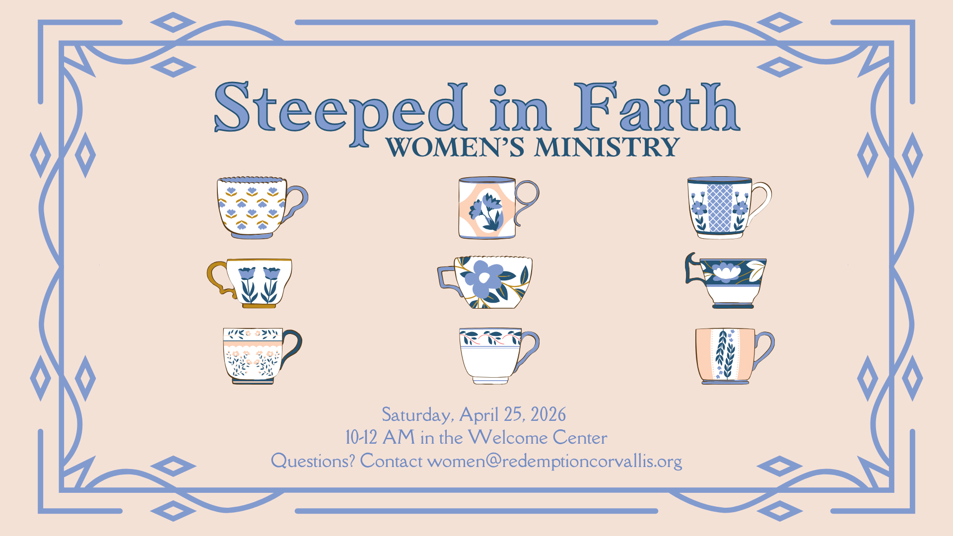 Women's Ministry will be having tea, pastries, and light brunch options while studying the Bible together. Join us on Saturday, April 25th from 10-12 AM in the Welcome Center for fellowship time with other women. Bring you own teacup if you'd like, some will be provided. Contact Mattea here with questions!